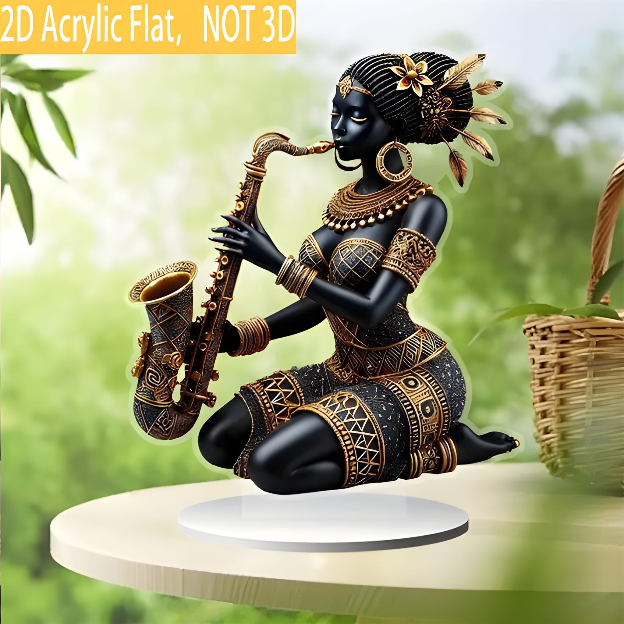 Bring music, art, and tradition into your decor with the African Lady Figurine with Saxophone. Handcrafted with care, this 2D acrylic statue combines tribal artistry and modern style, making it an eye-catching centerpiece for any room.