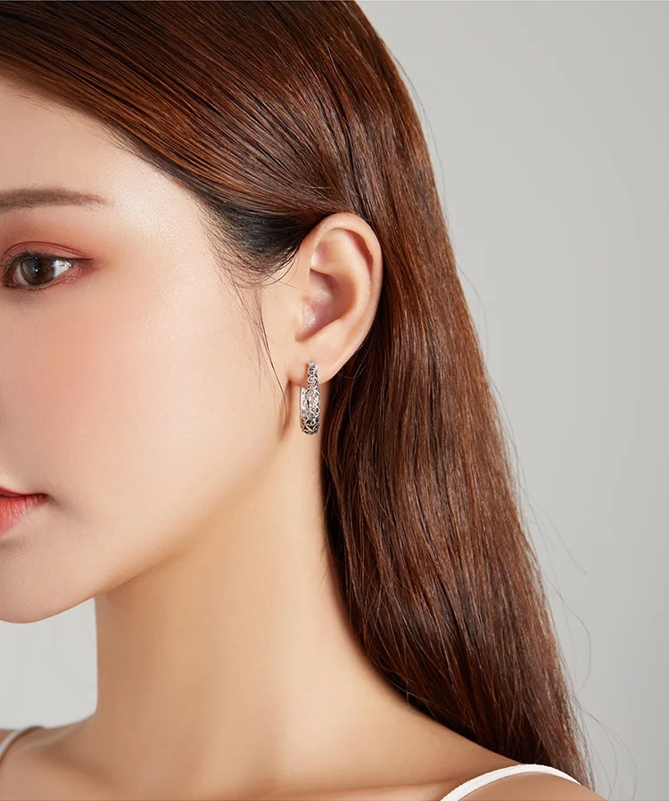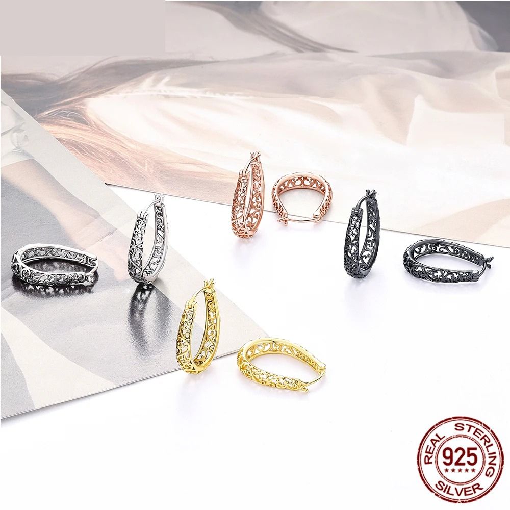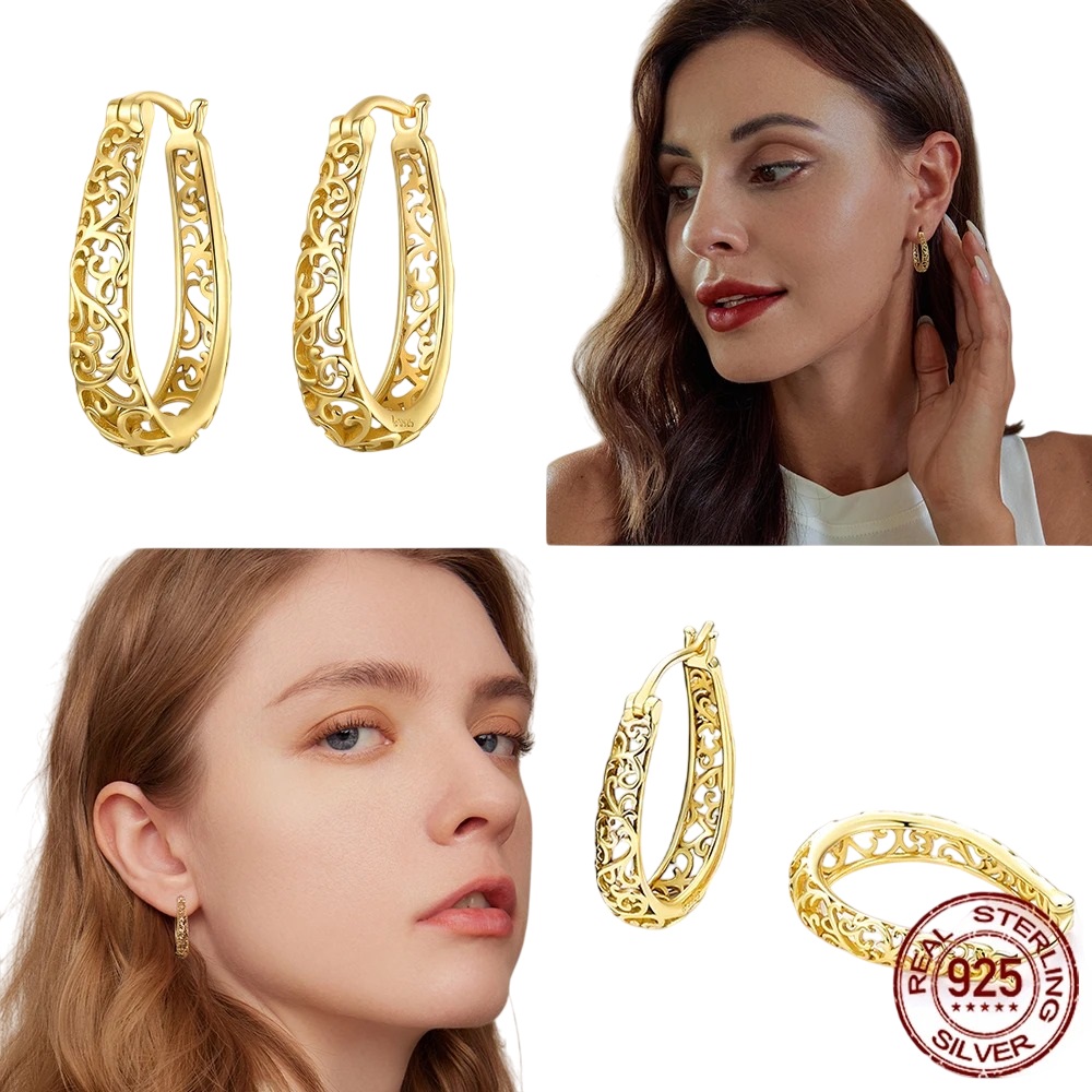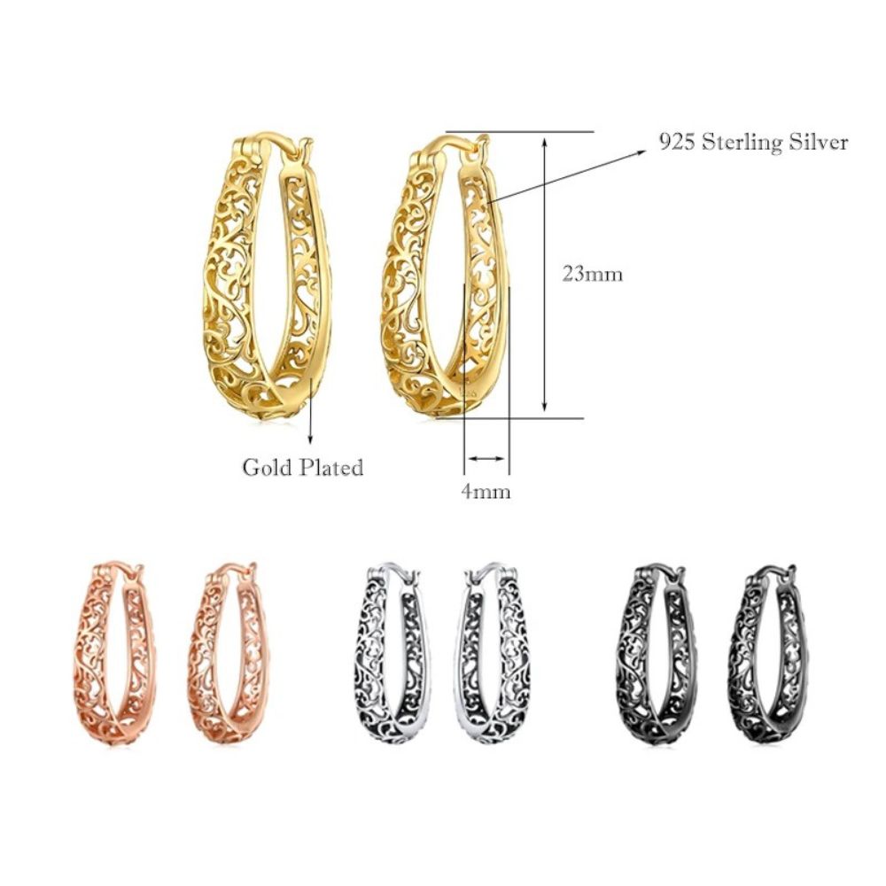 These Filigree Hoop Earrings are the perfect combination of contemporary style and classic charm. Made entirely of real 925 sterling silver and coated in shimmering 18K gold, each earring features a beautiful openwork vine mesh pattern that evokes elegance and skill. They are just the right size, measuring 23 x 4 mm, for both special occasions and daily wear.