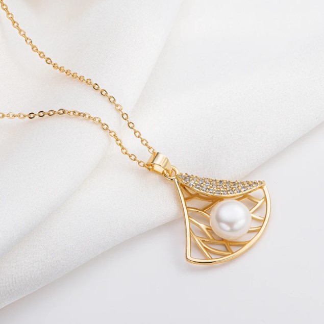 Featuring a single 9–10mm cultured freshwater pearl and a beautifully curved leaf that embraces a sparkling moissanite accent, this item is crafted from 14K gold-plated metal. The moissanite’s fire and the pearl’s delicate gloss create a stunning contrast, and the gold’s warm tone unites everything.