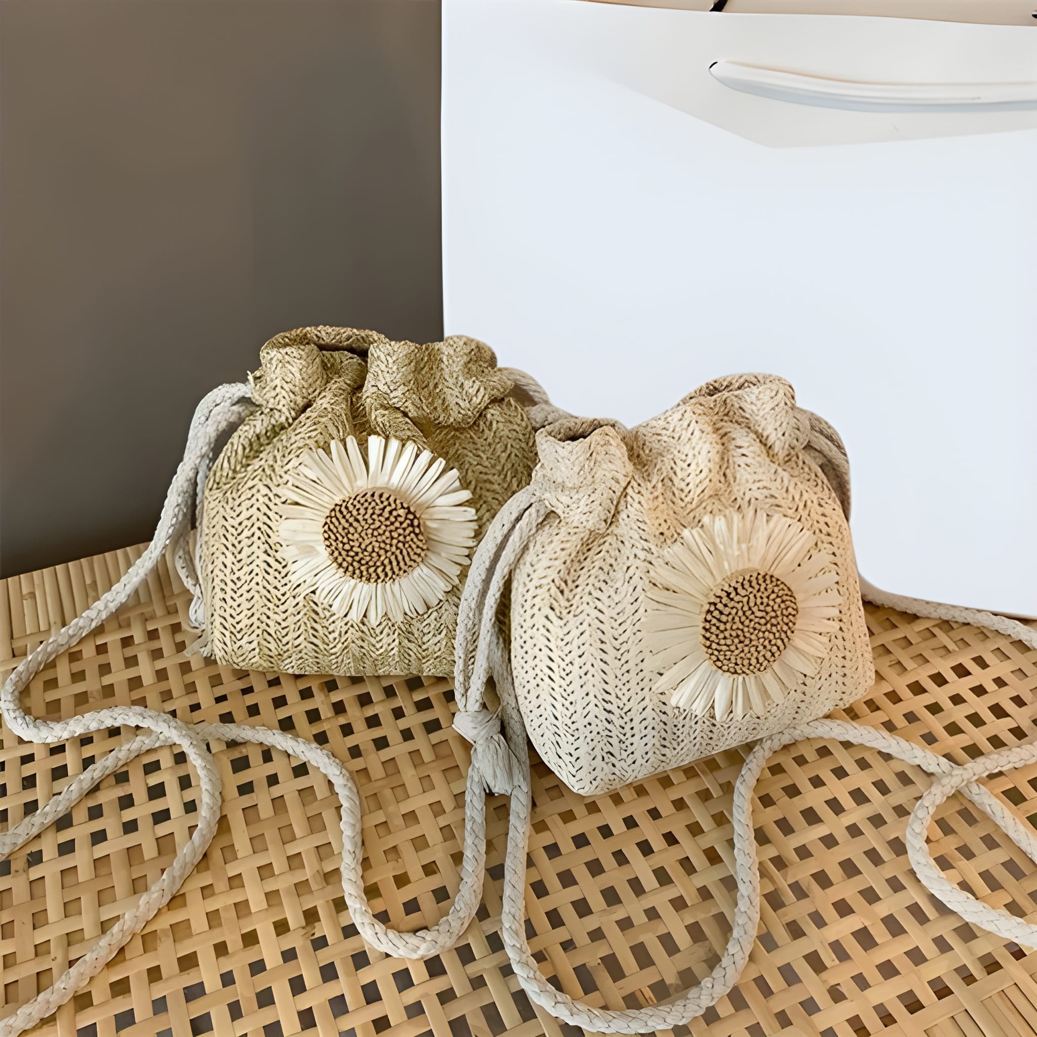 Summer Straw Rattan Crossbody Bag with Knit Floral Design